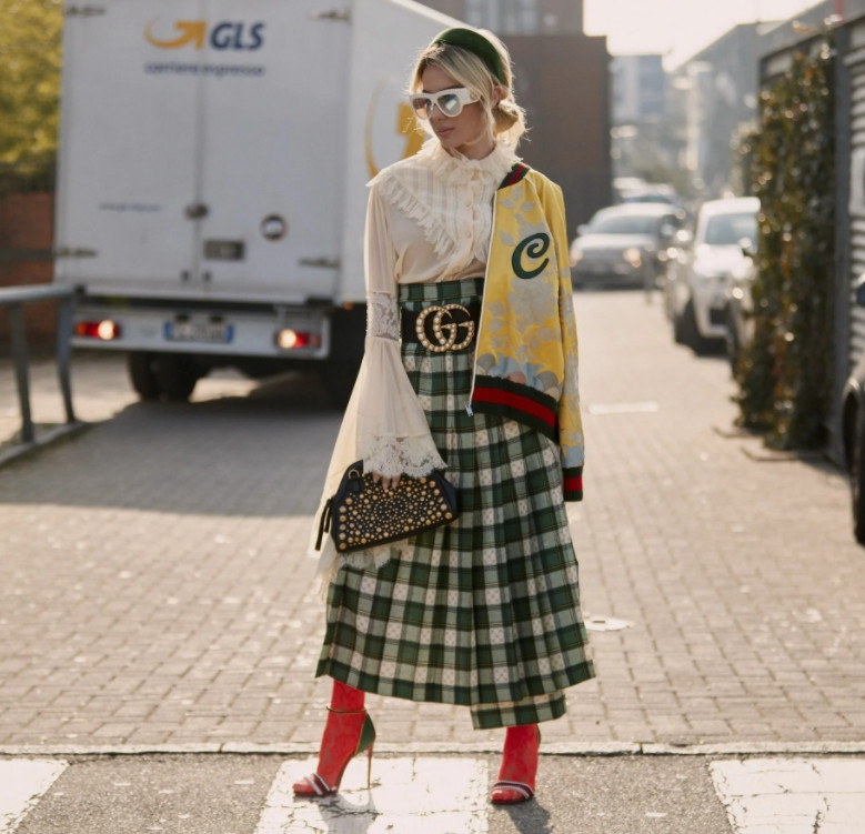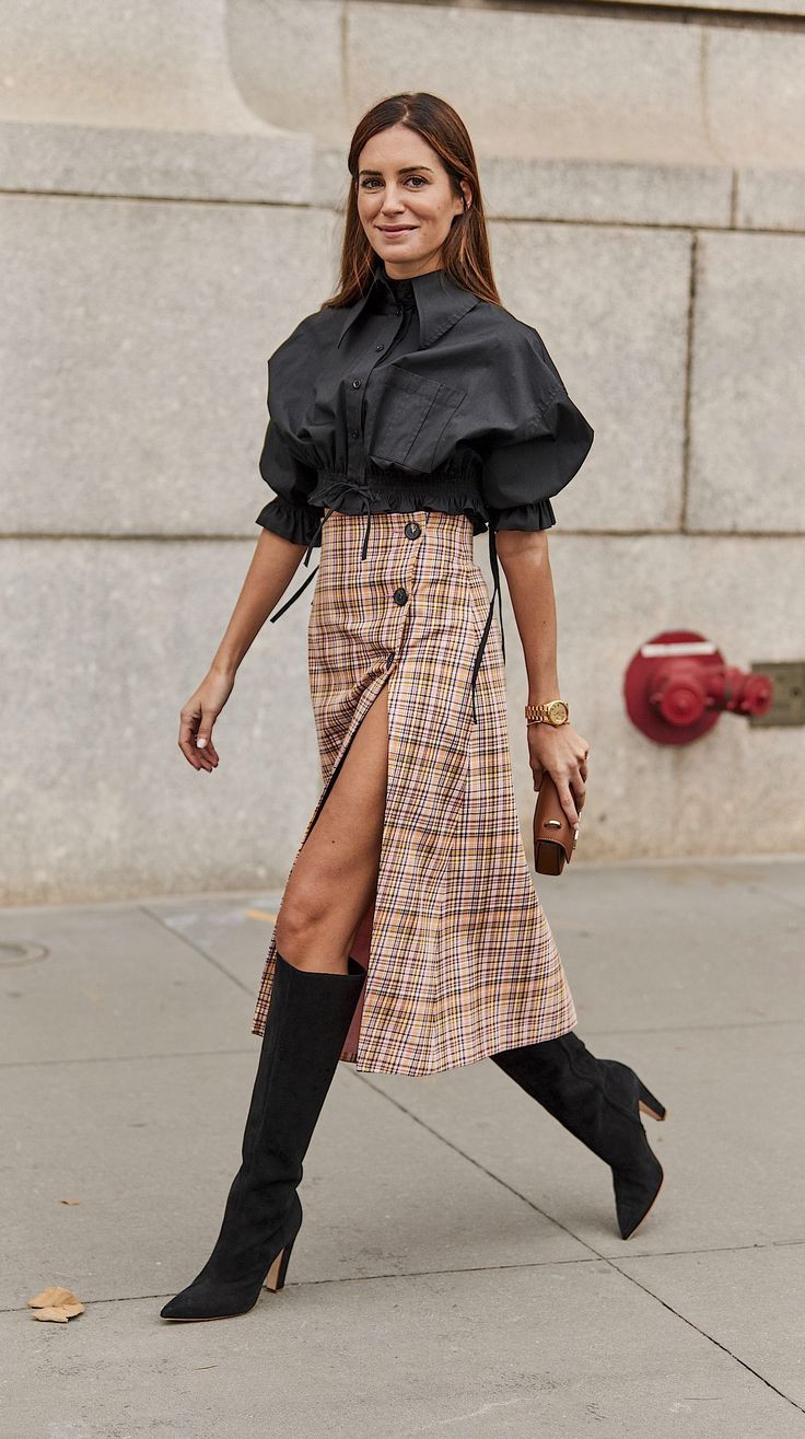 - Клетчатая юбка актуальна и в этом сезоне. Узор в клетку хорошо смотрится в классическом образе, в теплых и плотных тканях. Их расцветка варьируется от теплых красно-коричневых оттенков до холодных сине-черных. Под юбку можно надеть рубашку, блузку, джемпер. Наиболее востребованными в этом сезоне будут юбки из твида короткой и средней длины, формы трапеция и с запахом. Клетчатая расцветка идеальна для весны, осени и зимы.