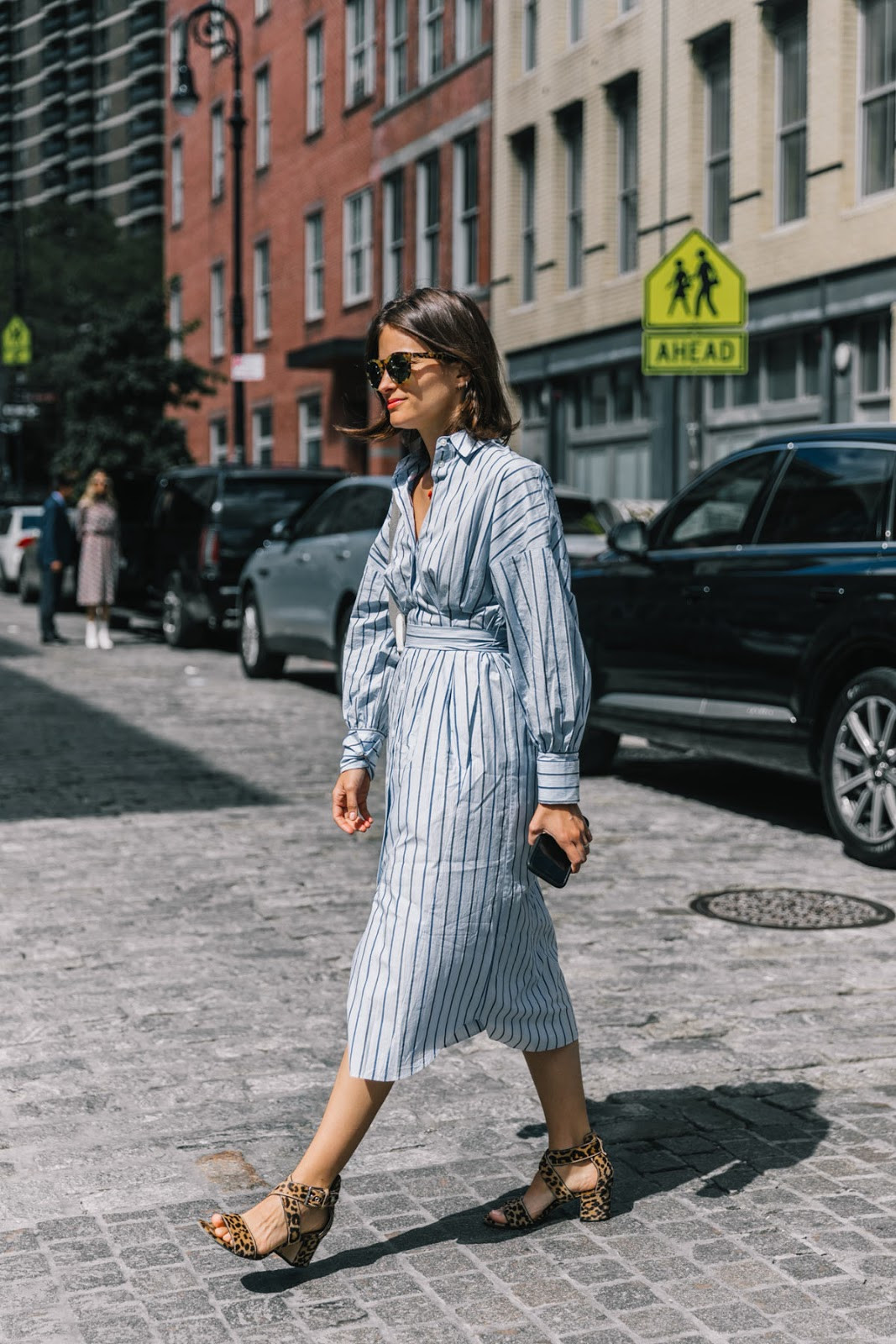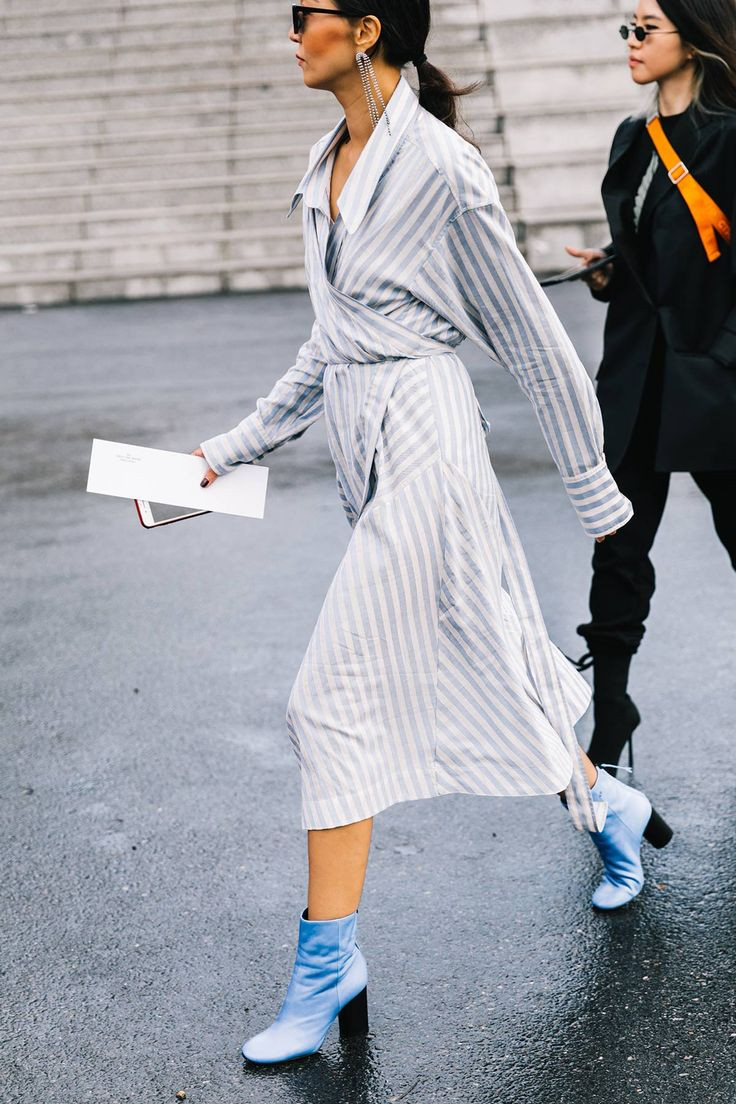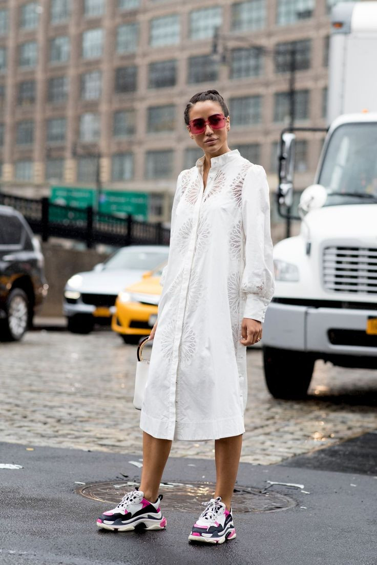 Сочетать платье-рубашку с рукавом-фонариком следует с туфлями, мюлями и босоножками. Кеды или кроссовки в этот образ впишутся только в том случае, если одежда до колена. Иные образы будут смотреться нелепо.