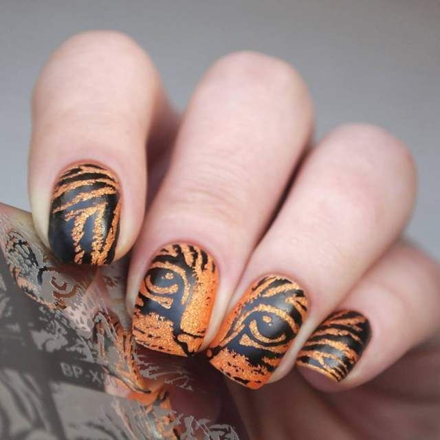 Новогодний дизайн ногтей может быть выполнен как на натуральные, так и на наращенные ногти, он может сочетать в себе разные цвета, а глаза можно выполнить стразами. Также символ года на ногтях можно выполнить в объеме пользуясь техникой объемной акриловой лепки. Например 2022 год это год Тигра, а ниже пример новогоднего маникюра.