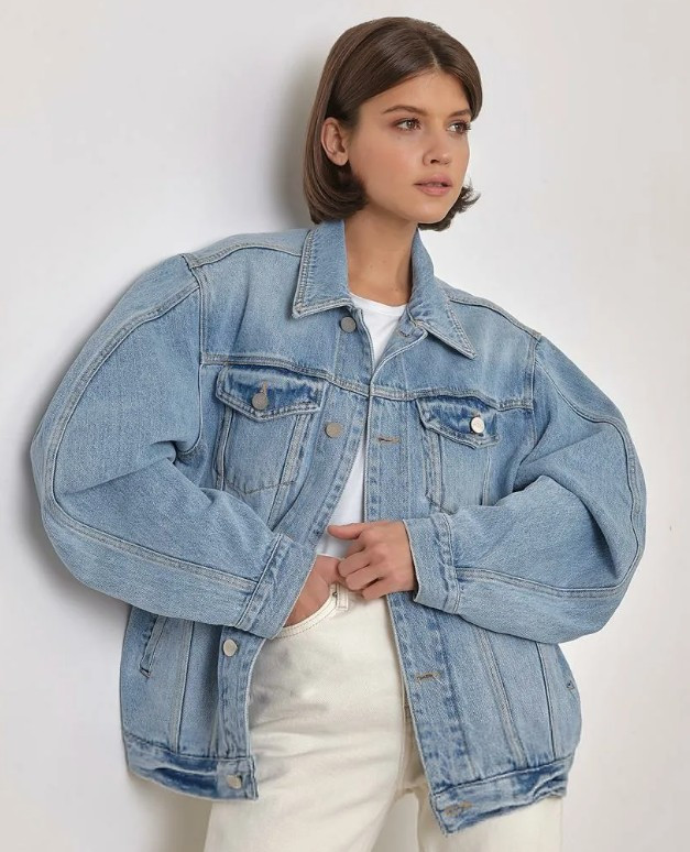 - Покрой модных джинсовых курток сезона 2023 — точно по фигуре или оверсайз, линия плеч — с широкой спущенной округлой проймой, прямой силуэт.