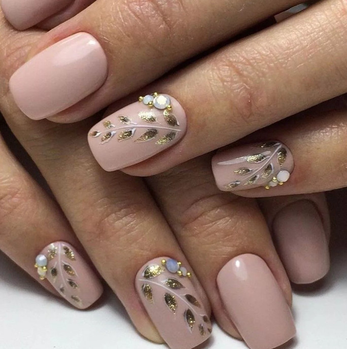 Сдержанная нежная палитра оттенков в сочетании с блестками и стразами позволяет создать невероятный маникюр. Очень интересно смотрится абрикосовый гель-лак со стразами. Элегантно и женственно будет выглядеть тандем с розовым топом. Милым будет казаться маникюр в ирисовом цвете.