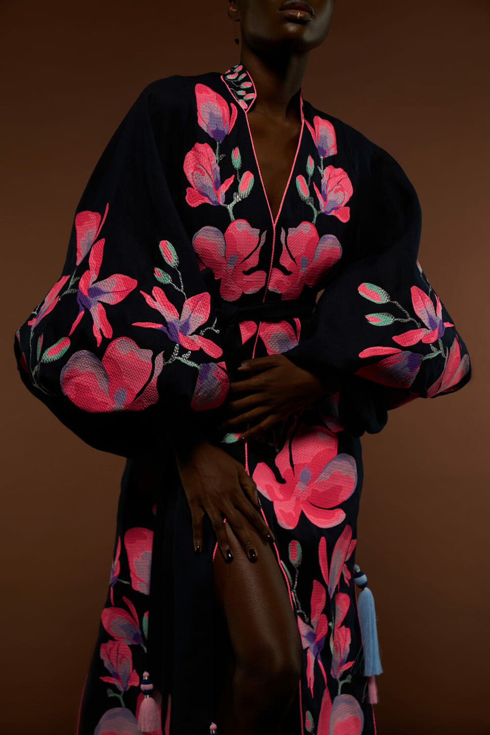 EtnodimVarenyky FashionНевагомі лляні максісукні – справжній мастхев цього літа. Моделі базових відтінків з флористичними візерунками, як у Varenyky Fashion, чи варіант темно-синього кольору з акварельними, що немов зійшли з полотен художників-імпресіоністів, квітами, як у Yuliya Magdych, – вибір за вами. Такі сукні не потребують додаткового стилістичного обігравання – вони стають головною прикрасою всього образу.