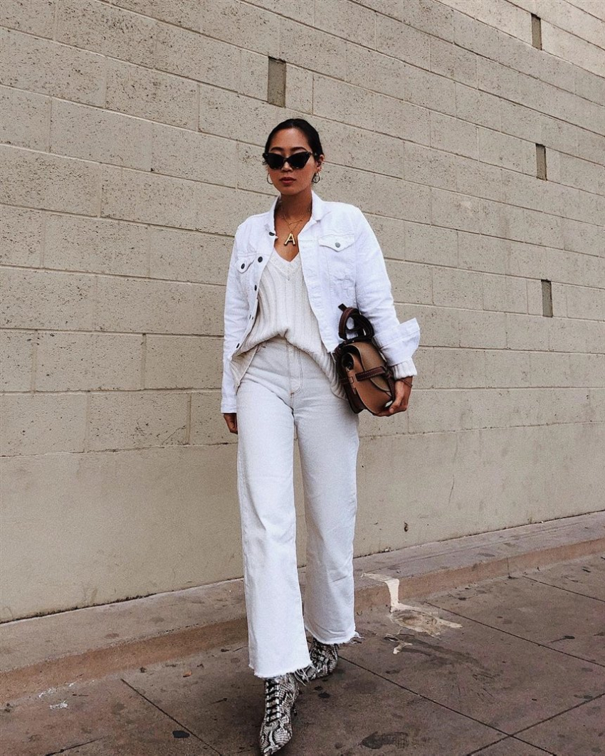 Наличие белых джинсов в гардеробе женщины — признак хорошего вкуса. Такие брюки можно сочетать как с классическим, так и с ежедневным стилем. Лучше всего джинсы белого цвета смотрятся в зимнем комплекте со свитером крупной вязки. На вид это очень уютное сочетание, которое подчеркивает белизну снега.