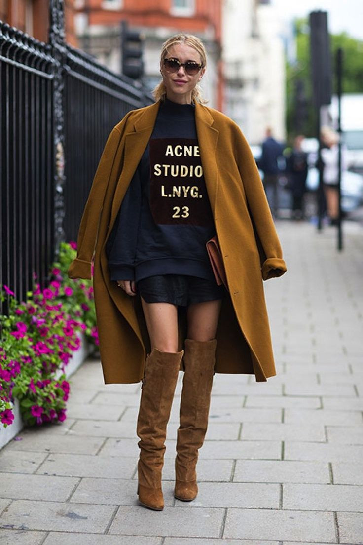 Очень эффектной обувью, и в то же время идеальной для холодных дней, являются сапоги выше колена, длинное голенище которых закрывает ноги. В этом сезоне они будут гармонировать с платьями, юбками, а еще и с шортами-бермудами.
