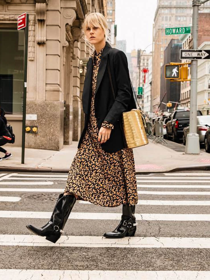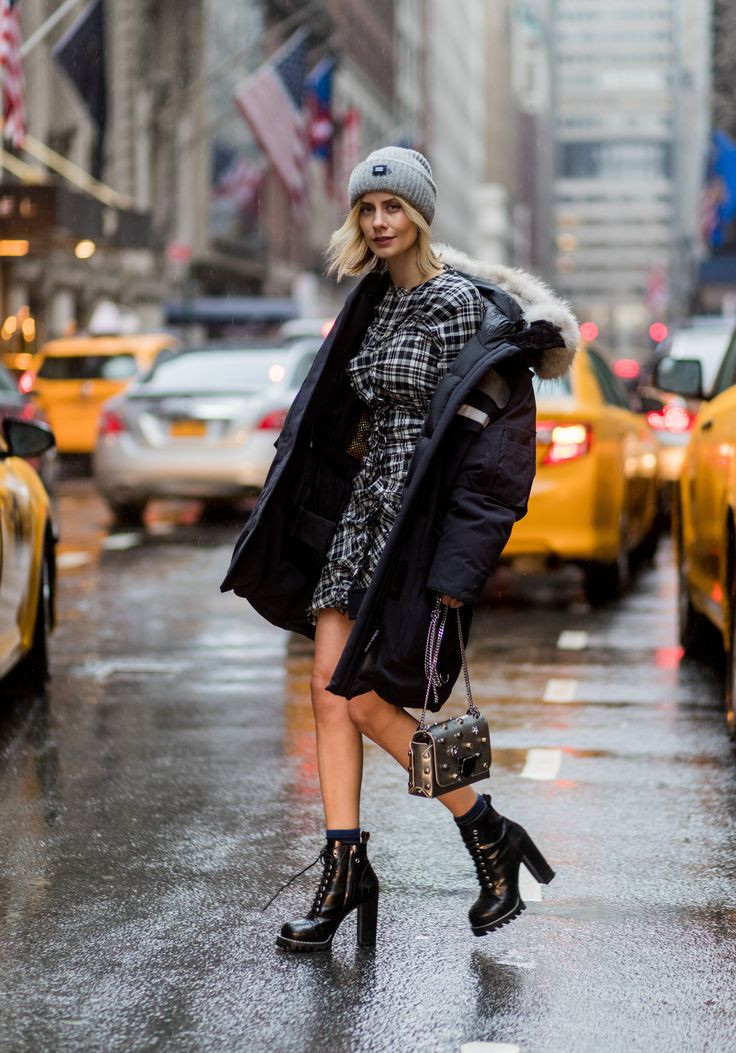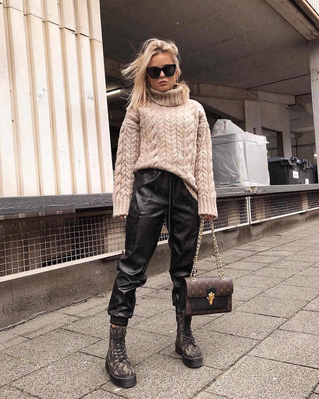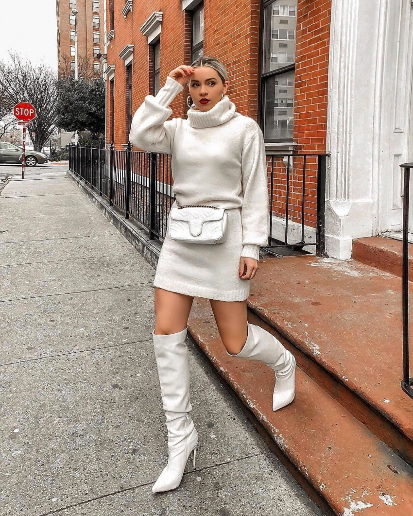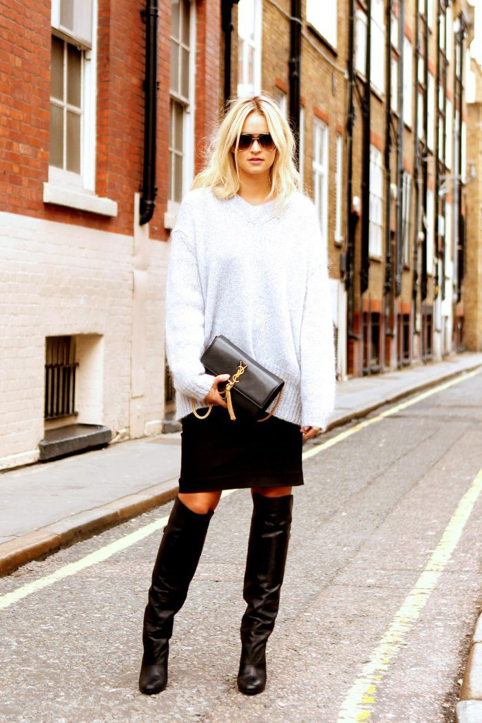 Такую обувь всегда нужно сочетать с узкими брюками, джинсовыми куртками. Свободные штанины плохо смотрятся с широким верхом с гофрами. Хорошо дать волю своему воображению при выборе юбки или платья. В паре с такой модной обувью красиво смотрятся вязаная юбка-карандаш или мини-юбка с толстыми воланами. Еще можно надеть свой любимый зимний свитер. Более длинная, например, в оверсайз-варианте, подойдет как туника к леггинсам или даже платье к непрозрачным колготкам.