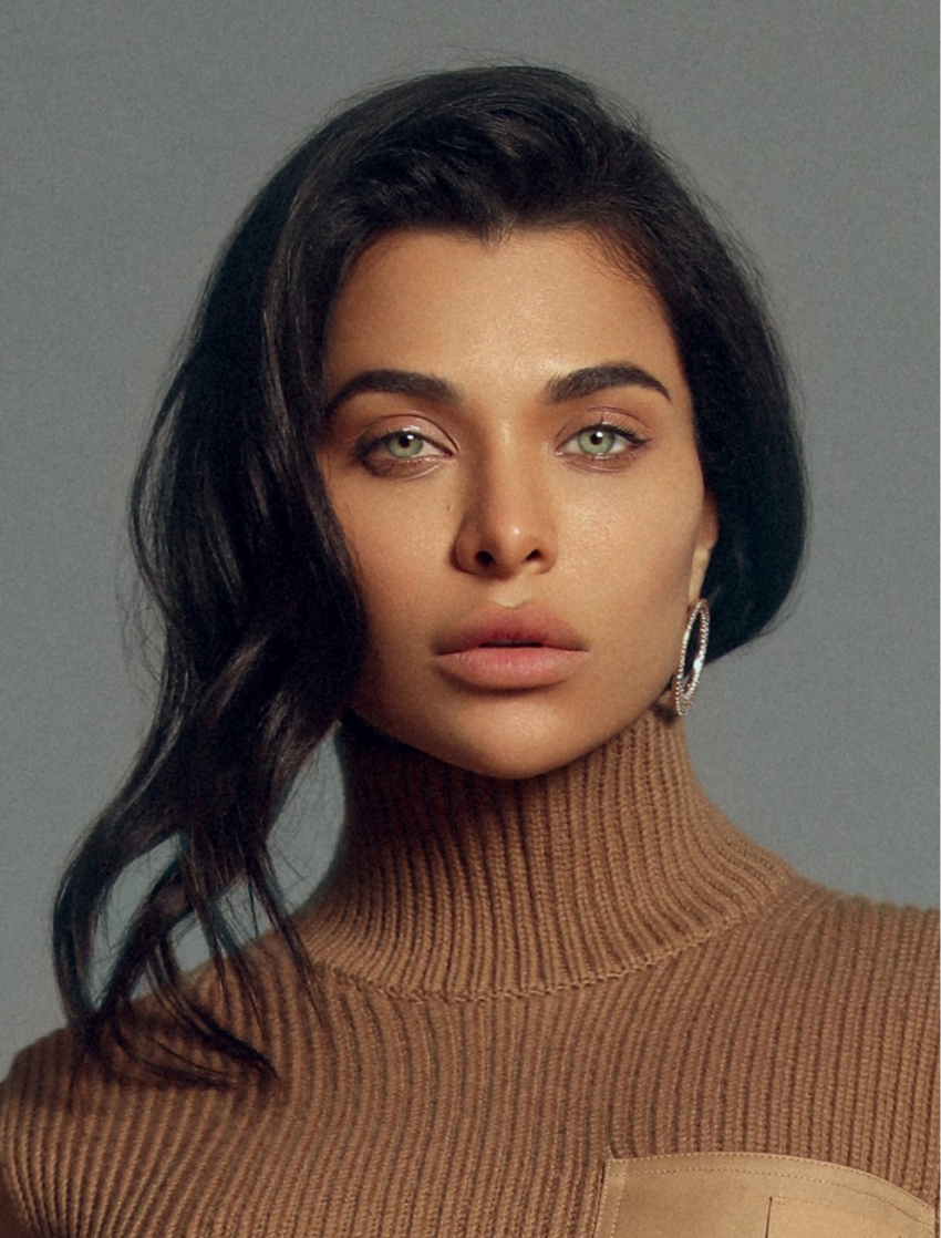 Сукня з віскози, Amanda Perna; сережки та каблучка, жовте золото, діаманти, все — Kirsten DrewГусті брови – головний акцент образу, який дозволяє носити хоч макіяж без макіяжу, хоч зухвалі стрілки до скронь.