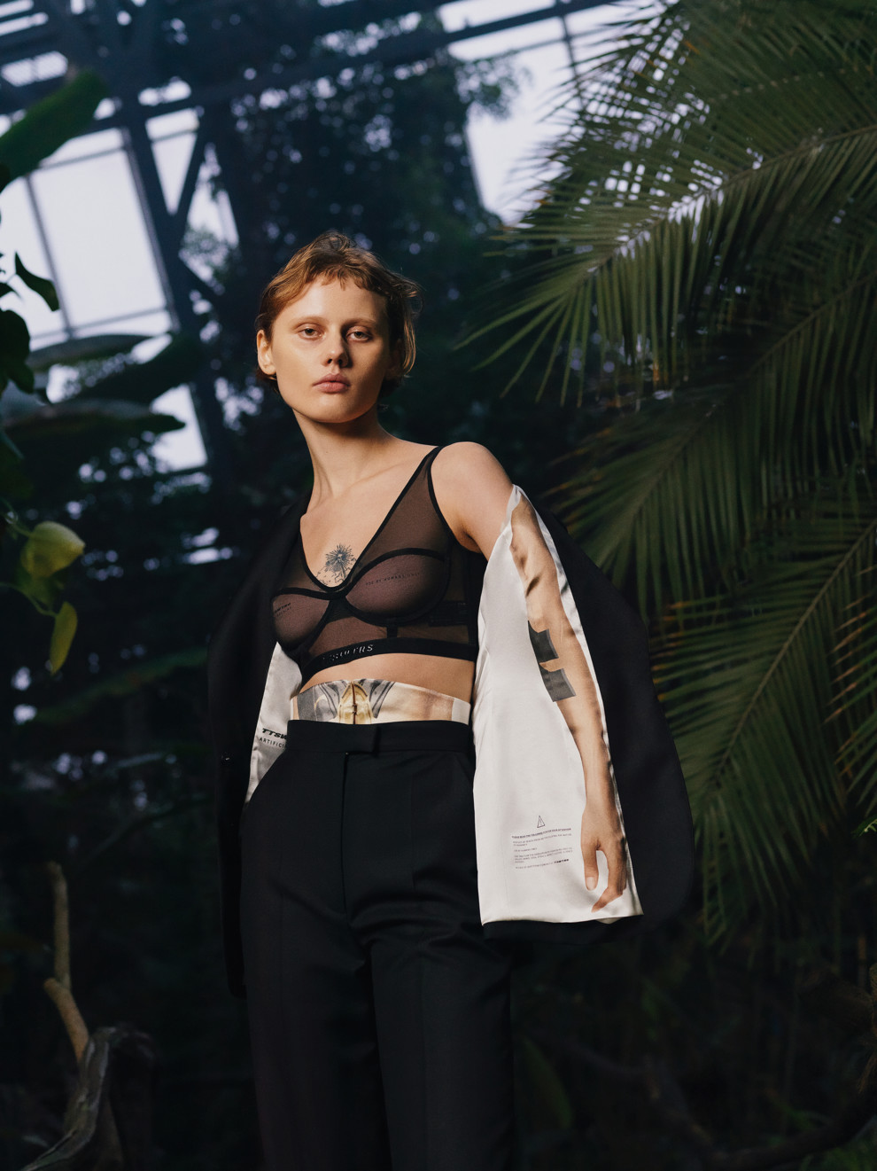 В коллекцию вошли брючный костюм с телесным принтом на внутренней стороне, переосмысленные через роботизированные детали классические черные платья, одежда из черной глянцевой кожи с принтами, вдохновленными искуственными интеллектом, которые контрастируют с элегантными кружевными элементами.