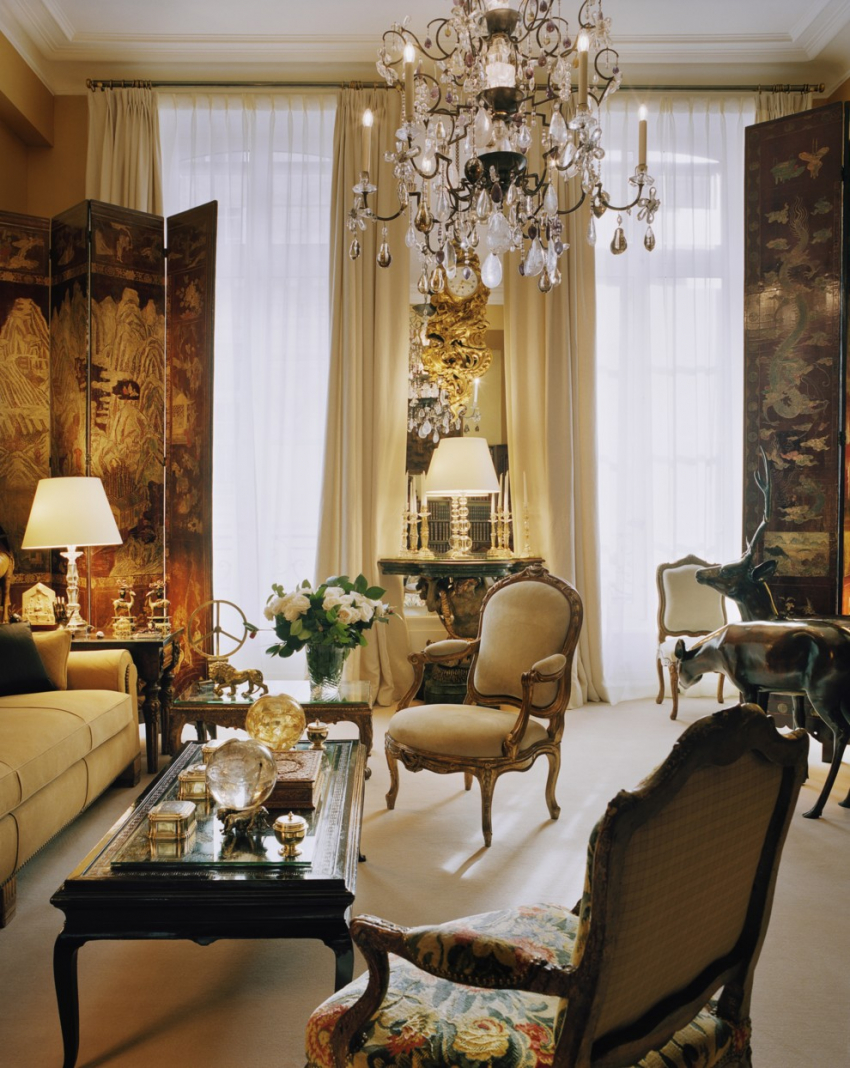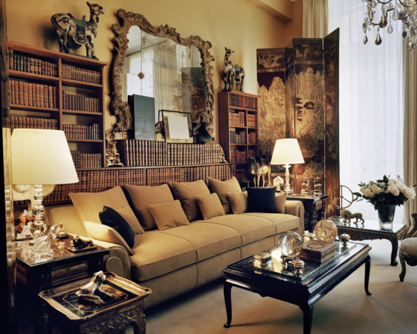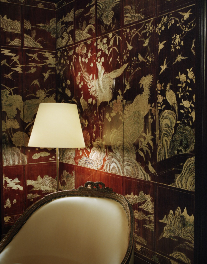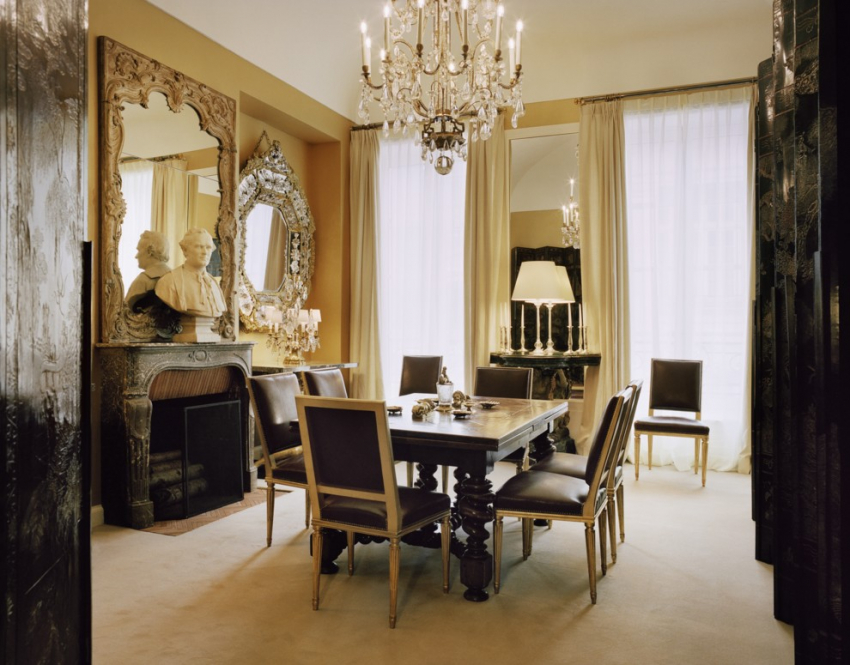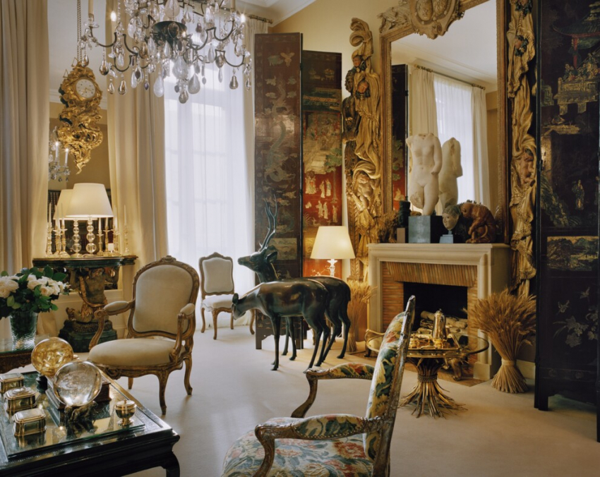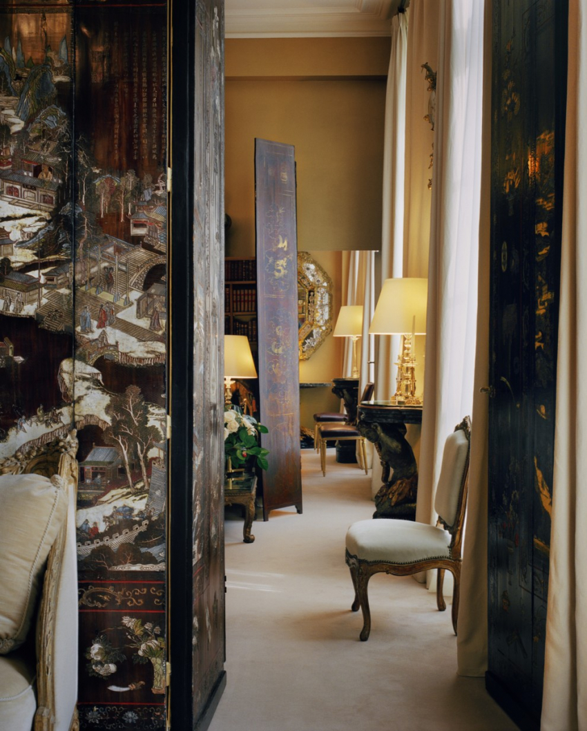 Полы в апартаментах укрыты бежевыми коврами, в ворсе которых приятно утопают ступни. Бескомпромиссная роскошь, особенно для холодного времени года, когда в Париже дождь и слякоть. Портьеры усиливают впечатление: тяжелые, с ровными складками, они подчеркивают высоту потолков и выстраивают геометрию богатого деталями пространства. Их здесь часто задергивали, чтобы оставить суету городской жизни за окном, и создать иллюзию камерного пространства, сказочной кроличьей норы.