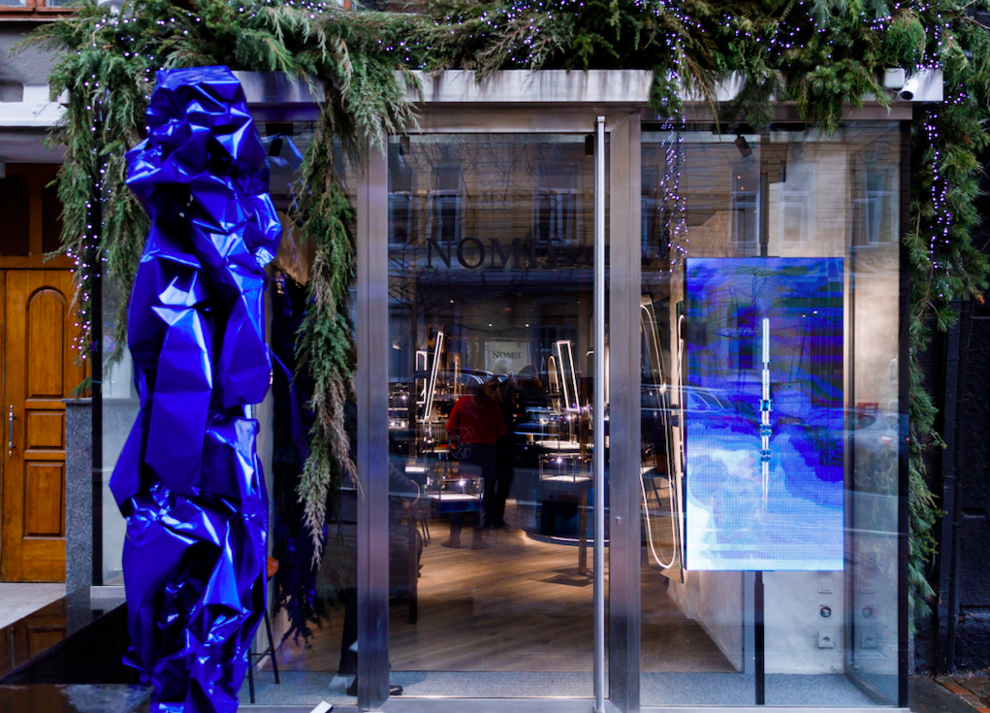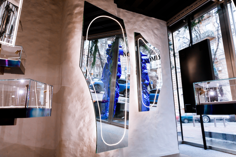Фасад бутика Nomis украшают экран с digital-артом и синяя металлическая скульптура современного украинского художника Михаила Деяка — его работы находятся в частных коллекциях Украины, Канады, США, Великобритании, Франции, Швейцарии, Венгрии и Китая.