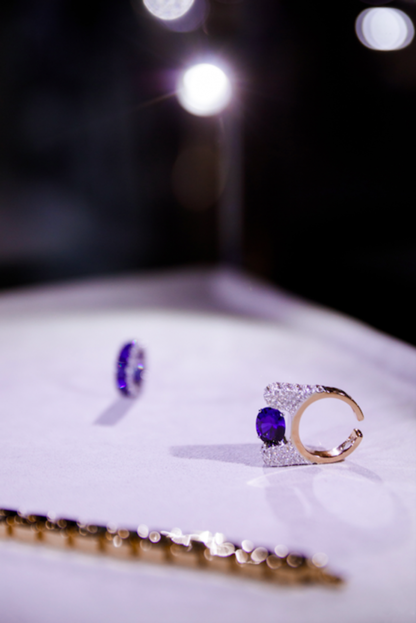 Над интерьером бутика работали девелопер Арье Шварц и дизайнер Елена Добровольская, создающие проекты по всему миру. Металлические поверхности, зеркала, множество источников холодного белого света и синие акценты создают в пространстве атмосферу футуристичности. Синий выбран главным в интерьере не случайно — он символизирует сапфиры, которые часто использует бренд в своих украшениях.