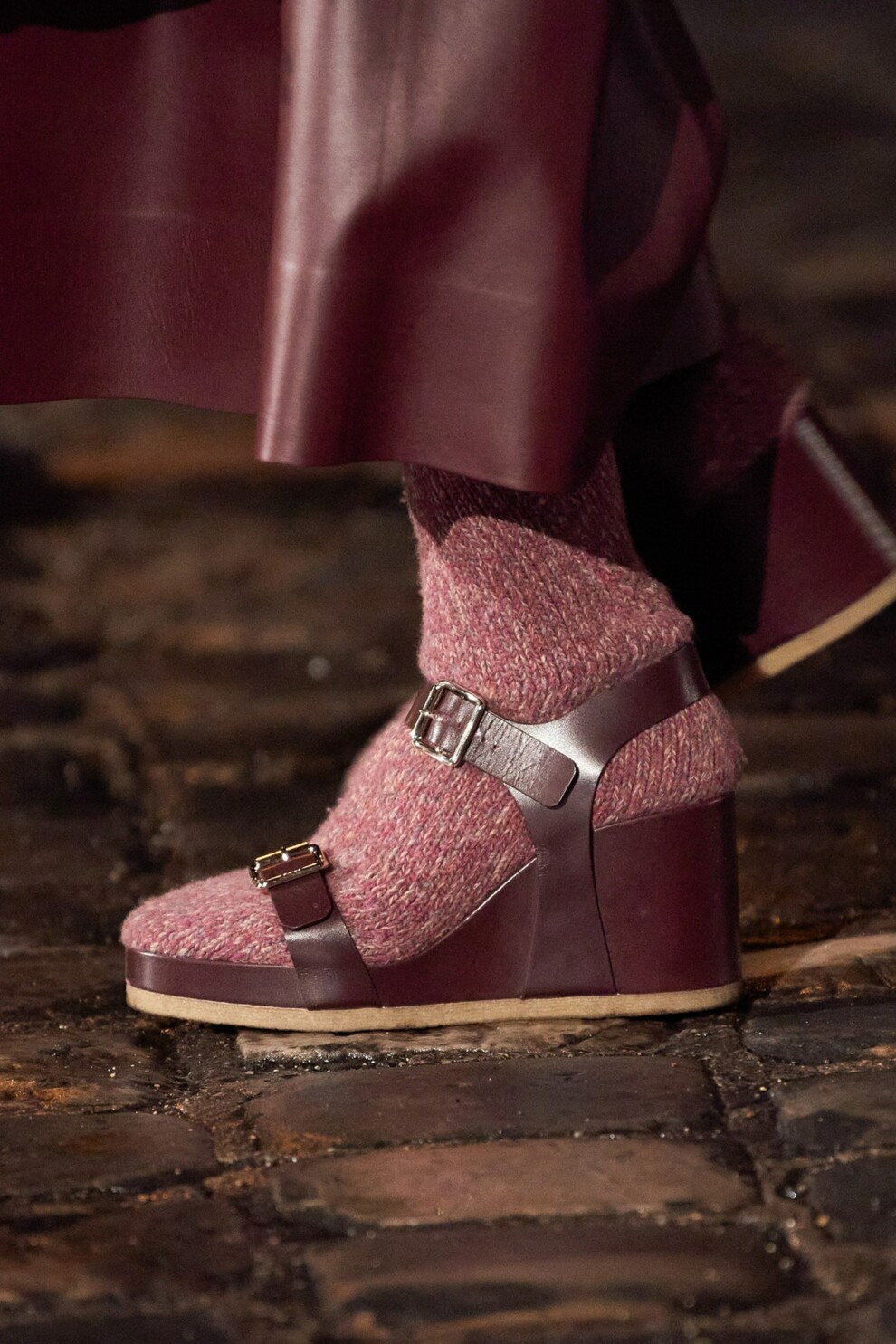 ChloeМодные бренды трактуют этот тренд по-своему. У Chloé преобладают "пушистые" и яркие носки, у Acne Studios - вязаные, заигрывающие с тенденцией кроше и окрашенные в ярко-розовый цвет, а у Maryam Nassir Zadeh - привычные серые. Главные новинки были замечены именно в обуви - сандалиях и босоножках.В прошлом сезоне было показано действительно много сочетаний сандалий на плоской подошве с носками, и теперь кажется, что сложно придумать что-то новое. Однако главная ставка коллекций осень-зима 2021/2022 – это каблуки. Босоножки на высоком каблуке с тонкими ремешками Acne Studios имеют все шансы стать классическими, поскольку благодаря этой минималистичной обуви можно играть с принтами и фактурами на носках. Chloé и Maryam Nassir Zadeh же представили сандалии на танкетке, которые на первый взгляд связаны исключительно с летними образами. Но благодаря дополнительному слою в виде шерстяных носков им легко найдется место и в осеннем гардеробе.