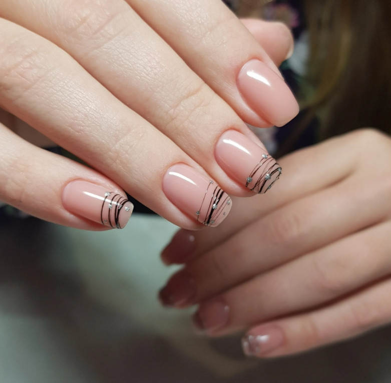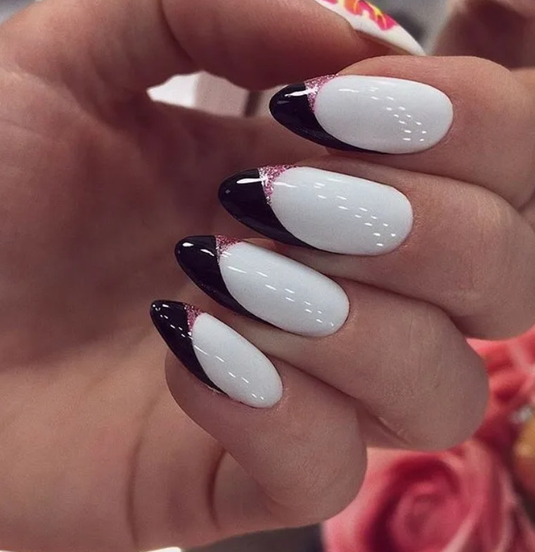 Белая окантовка больше подходит для нежного гламурного маникюра, черная — напротив, более экспрессивная, контрастная, сочетается со всей цветовой гаммой, разного рода декором. Выразительно смотрится со стразами, блестками, конфетти, полимерными камнями.