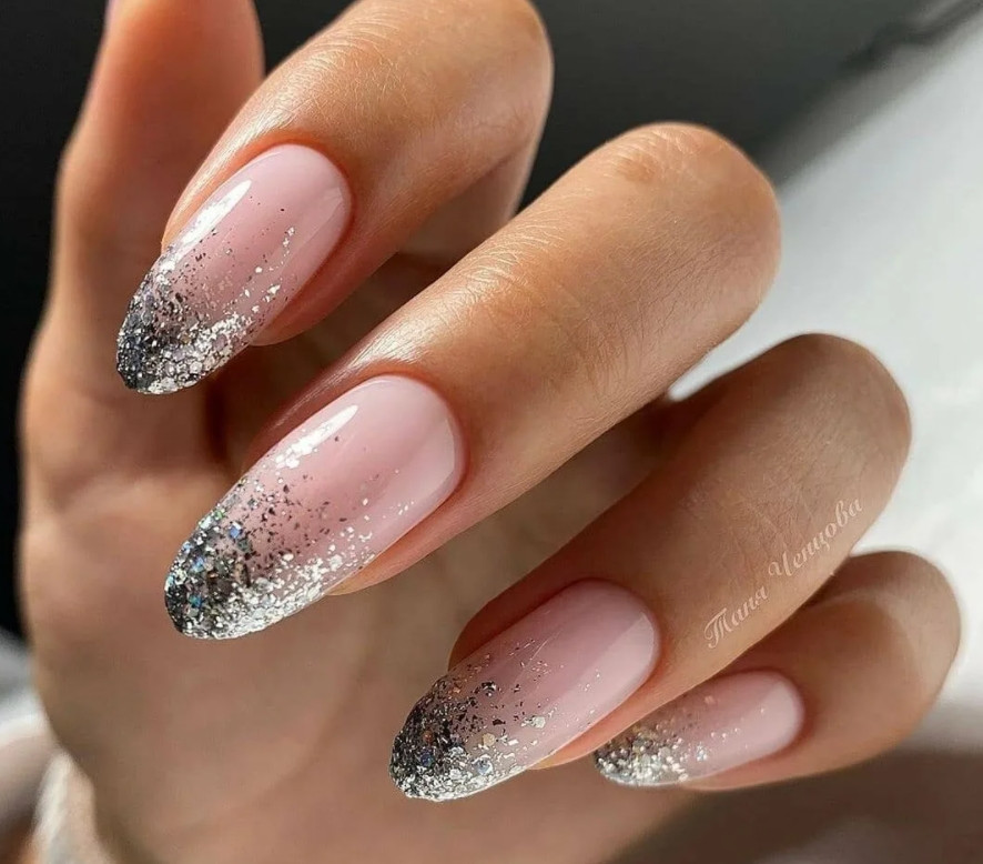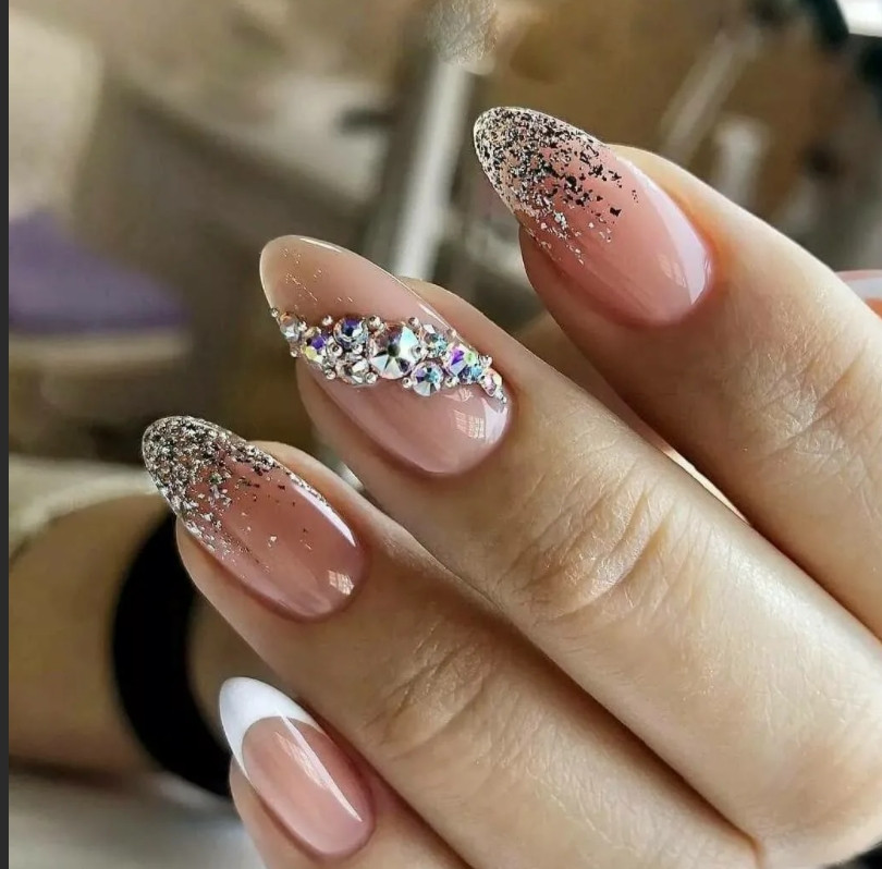 С блестящим декором нужно работать взвешенно. В основном такой френч подходит для разного рода торжеств.