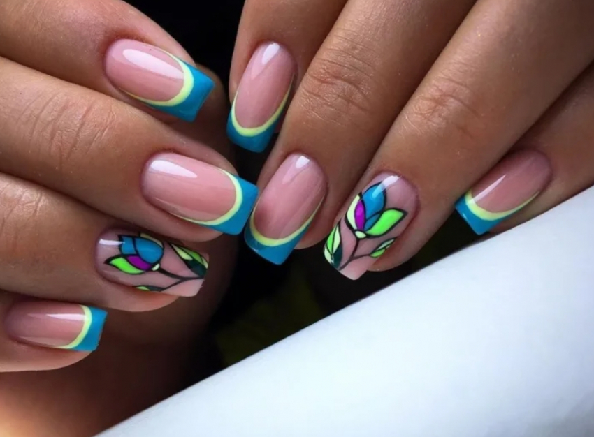 Хит сезона весна 2022 года — маникюр френч синих и изумрудных оттенков. Основная цветовая гамма, которую дизайнеры нейл-арта предлагают на этот сезон: