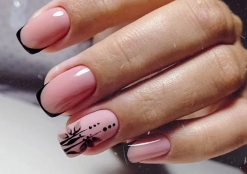 Черная «улыбка» в сочетании с глиттерным лаком придает глубину тону базы. Чтобы усилить контраст, иногда линию френча начинают от середины ногтя. Ярко выглядит черная окантовка в сочетании с геометрическими, абстрактными рисунками, наклейками. Интересное решение — чередование френча с обычным однотонным или разноцветным маникюром.