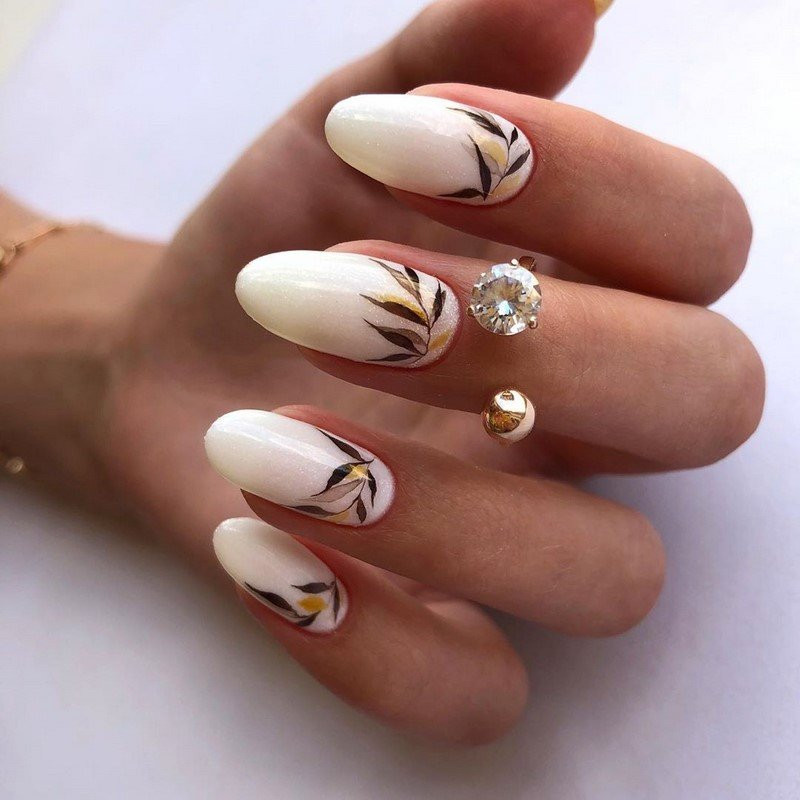 Одним из весенне-летних вариантов маникюра гель-лаком в 2022 году станет светлый основной оттенок с рисунками листьев. Выполнять узор можно любыми цветами: