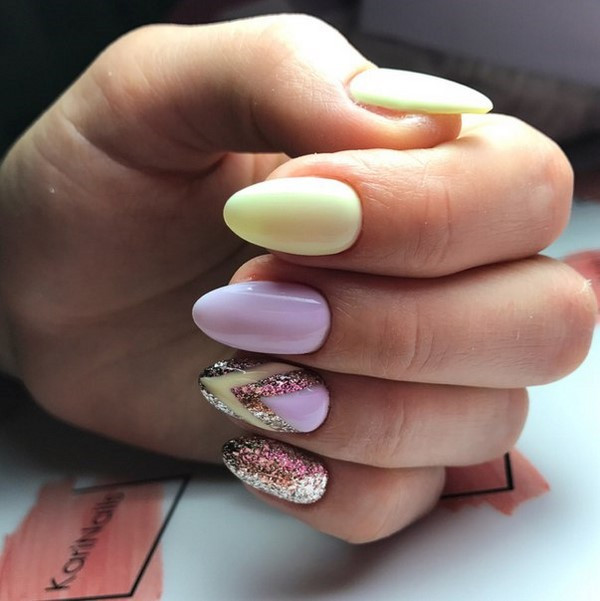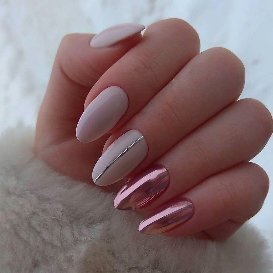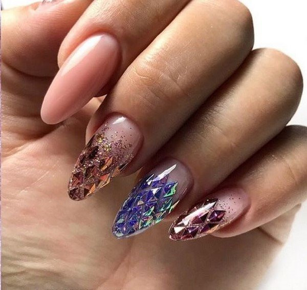 Покрывать блестками можно все ногти, несколько ногтевых пластин или использовать блестящий гель-лак в дизайне. В предстоящих сезонах актуальными будут не только стандартные золото и серебро, но и другие оттенки: