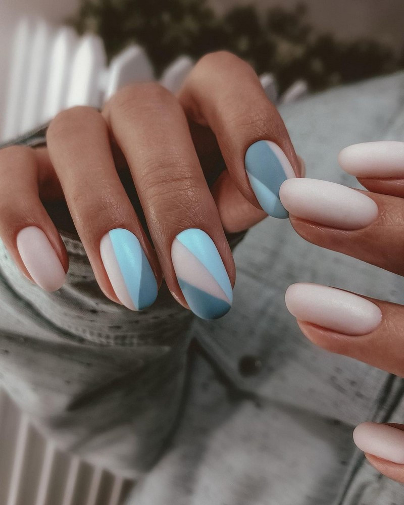 Актуальным на протяжении нескольких сезонов остается узор разводов краски. Выглядит это необычно, подходит для разных случаев. На отдыхе ногти синего цвета с голубыми и белыми разводами будут выглядеть, как морская пена. Также разнообразить узор можно, добавив лак золотого или серебряного цвета.