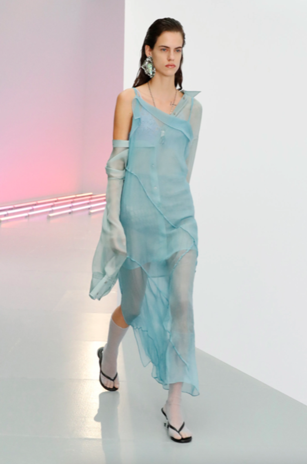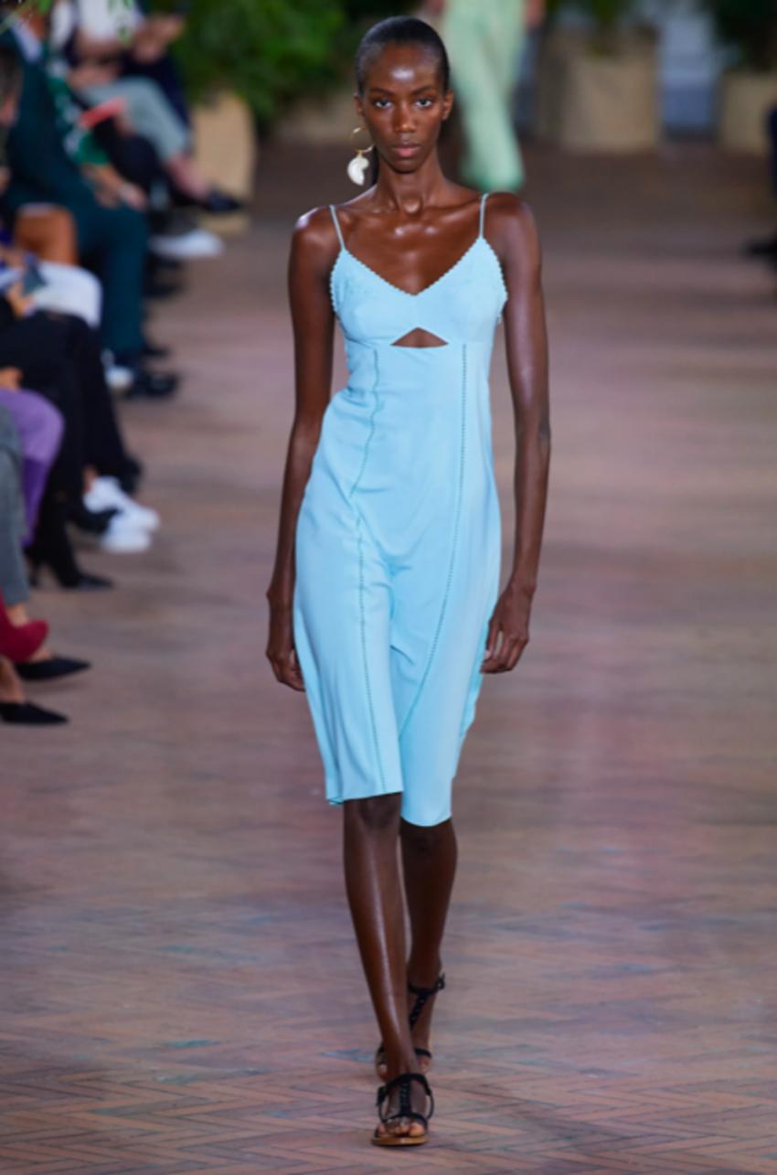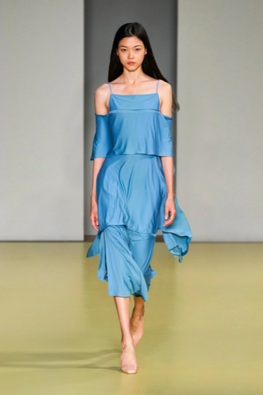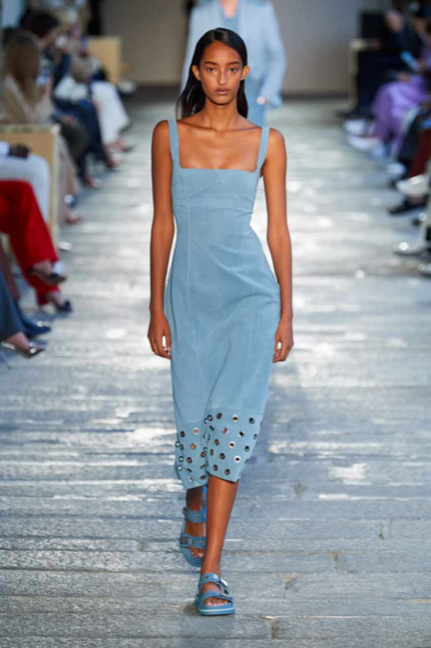 Acne StudiosVersaceБирюзовые платья из струящегося шелка можно было найти на показах Acne Studios и Versace. Многие образы, представленные Донателлой Версаче, отсылали к океану и его жителям. Платье, инкрустированное камнями и дополненное аппликациями, в котором дефилировала Ирина Шейк, способно быстро стать лучшим союзником летнего гардероба. Не менее эффектными этим летом будут миди-платья с асимметричными деталями или вырезами, как в коллекциях Alberta Ferretti и Salvatore Ferragamo. Платье с квадратным декольте, представленное BOSS, подойдет как для неспешных воскресных прогулок, так и для романтического свидания.