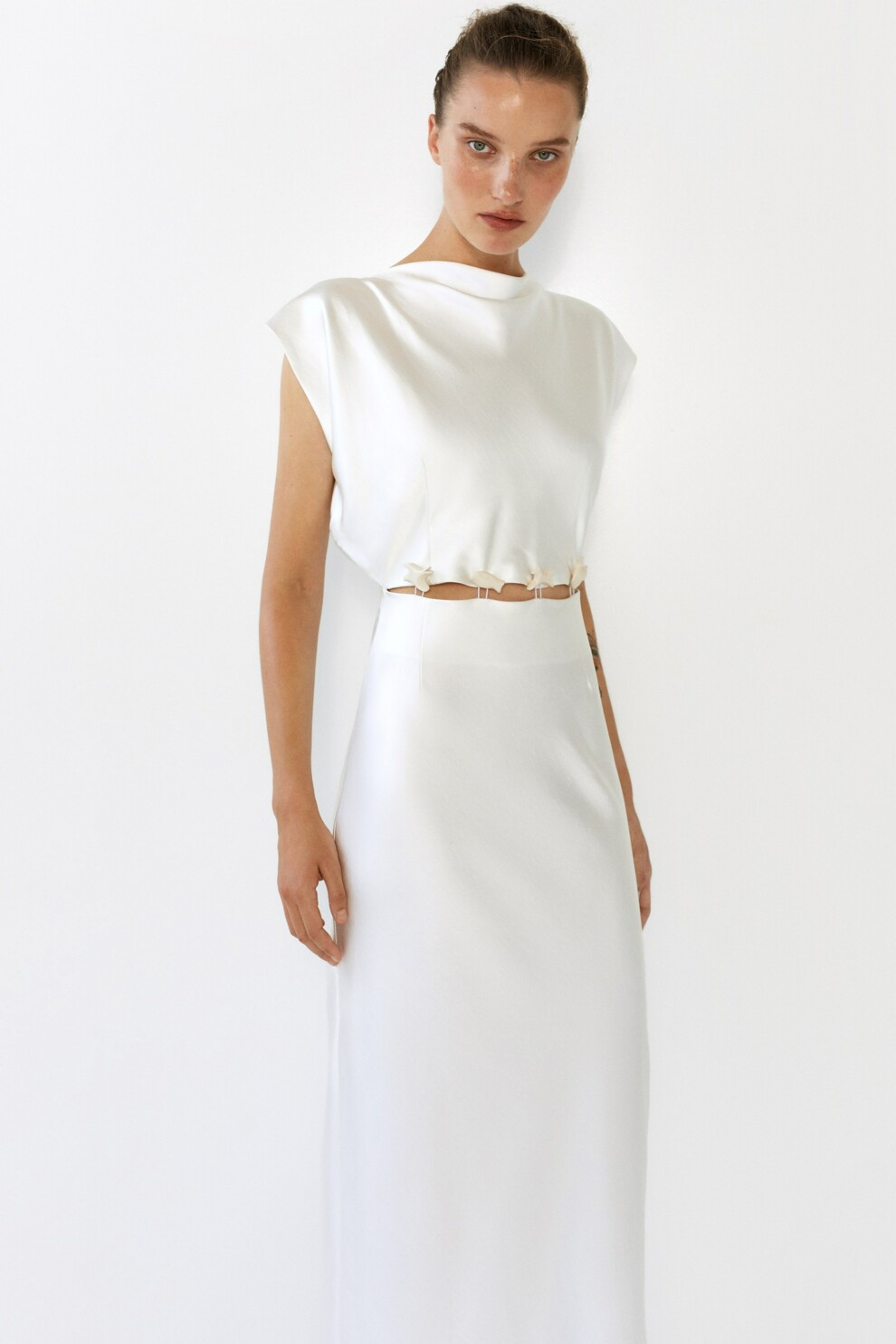 Giambattista ValliЕсли же мероприятие предполагает формат ночной вечеринки, то укороченный топ и юбка с разрезом Alessandra Rich станет лучшим вариантом на торжестве. К тому же, к образу можно надеть эффектные серьги размера XL. Подобный прием с украшениями применили Y/Project в своей коллекции весна-лето 2021, однако в их случае пару крупным серьгам составило белое вечернее платье со сложносочиненное линией рукавов.