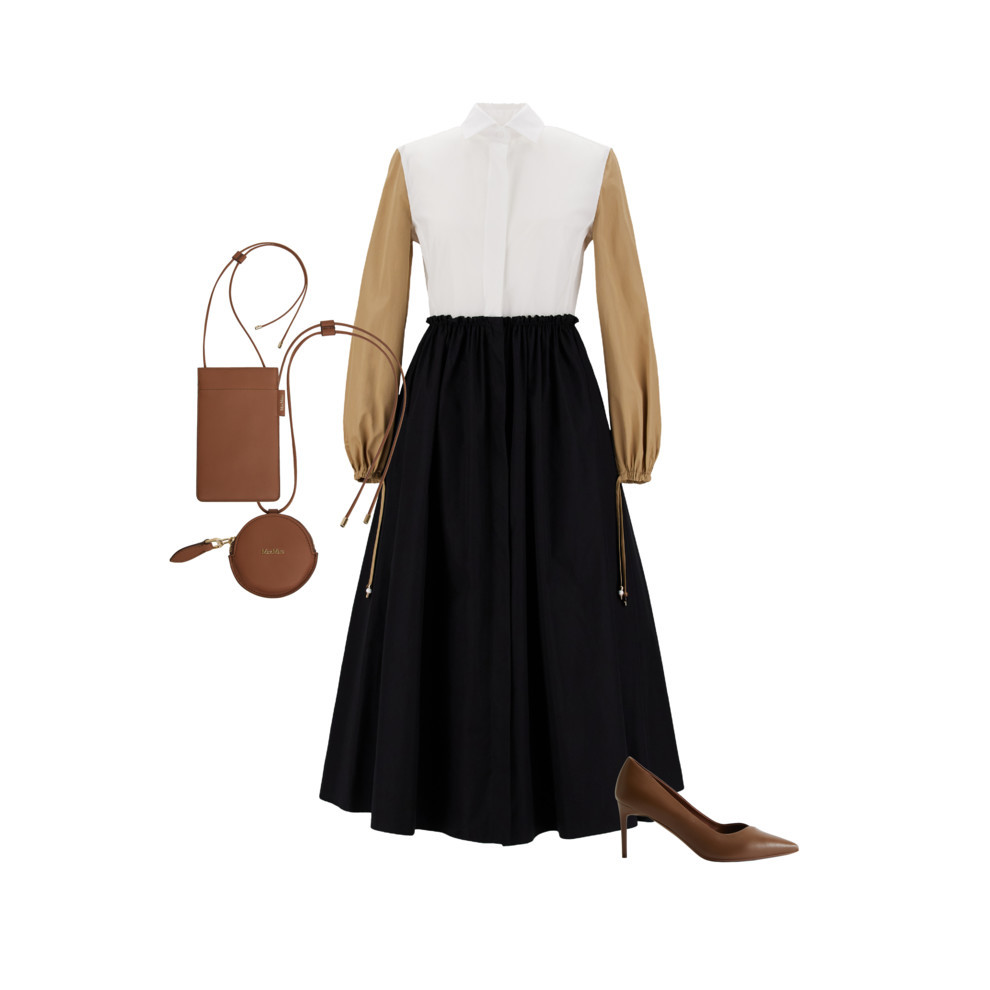 Приталенные платья А-силуэта занимают центральное место в универсальном и практичном женском гардеробе. Чистоту кроя подчеркивает практически полное отсутствие декора – все внимание на аккуратно подчеркнутой линии талии, которая делает силуэт женственным и утонченным. Классический фасон освежают контрастные рукава-буфы по мотивам моды 1940-х годов. Такие романтичные по духу платья можно дополнить игривой альтернативой классической сумки — например, используя два компактных кошелька, куда поместится все самое необходимое. Завершат образ туфли-лодочки на невысокой шпильке оттенка молочного шоколада.