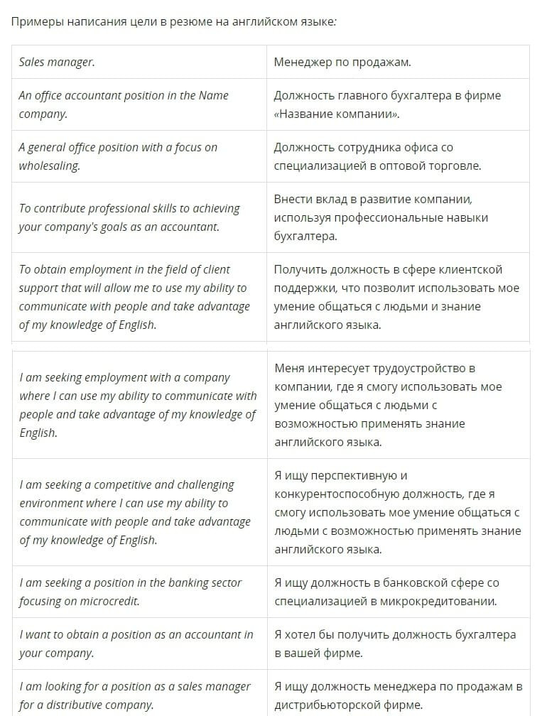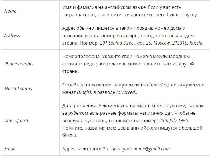 Резюме на работу на английском языке: шаблон с переводом на русский язык