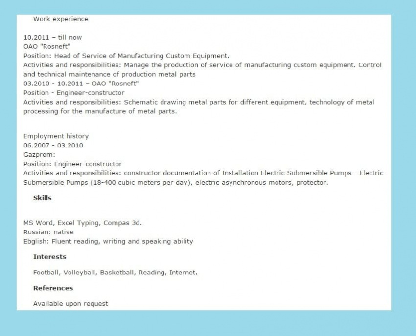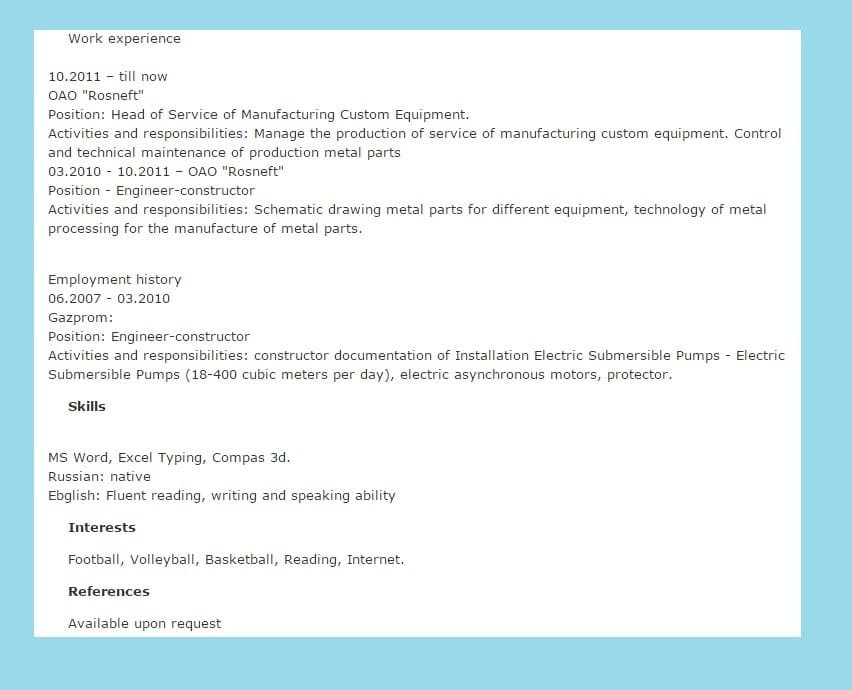 Как писать в резюме на работу на английском языке «Семейное положение», «Опыт работы», «Личные качества», «По настоящее время»: пример с переводом на русский язык