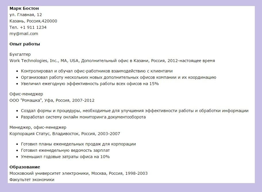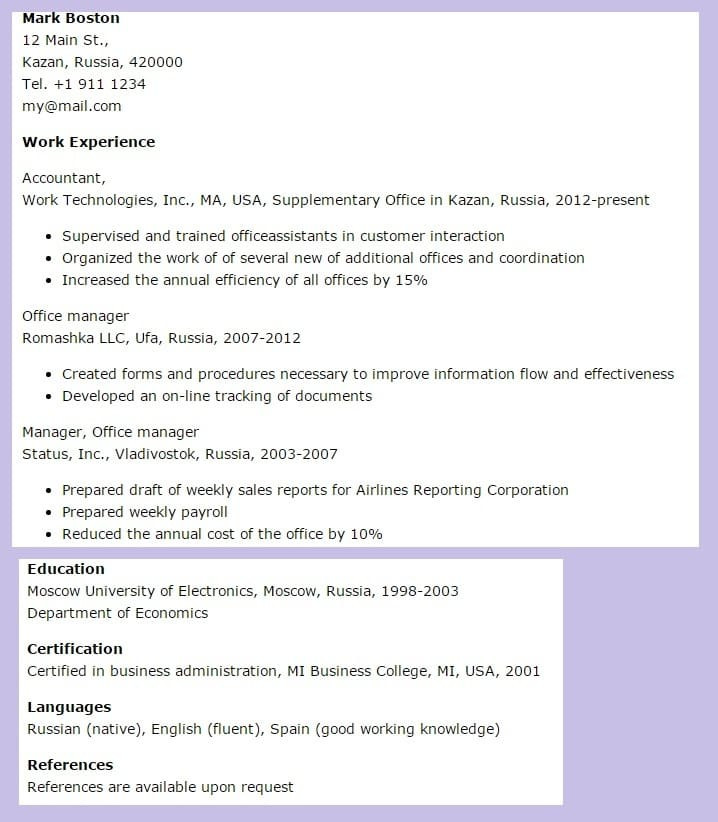 Резюме на английском языке: образец для бухгалтера с переводом на русский язык