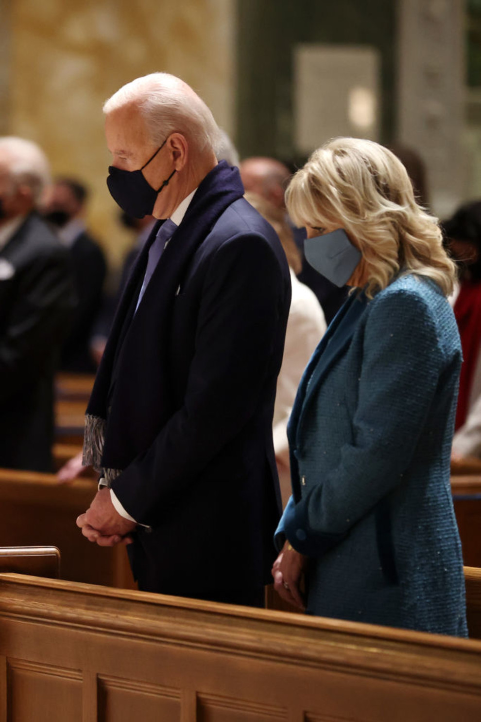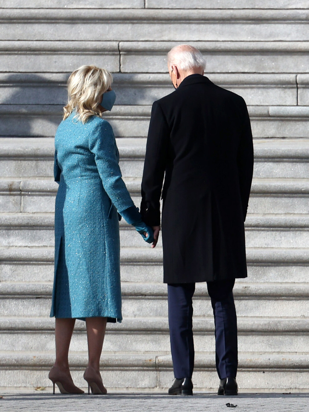 Джо и Джилл Байден на службе в Соборе Святого апостола Матфея"Пальто с темно-синим бархатным воротником и манжетами надевается поверх зауженного платья с шифоновым лифом и юбкой с фестонами», - сказала Александра О’Нил о дизайне наряда - "Вырез платья вручную расшит жемчугом и кристаллами Swarovski, имитируя нежные цветочные узоры. Те же кристаллы украшают пальто, тонко отражая свет".