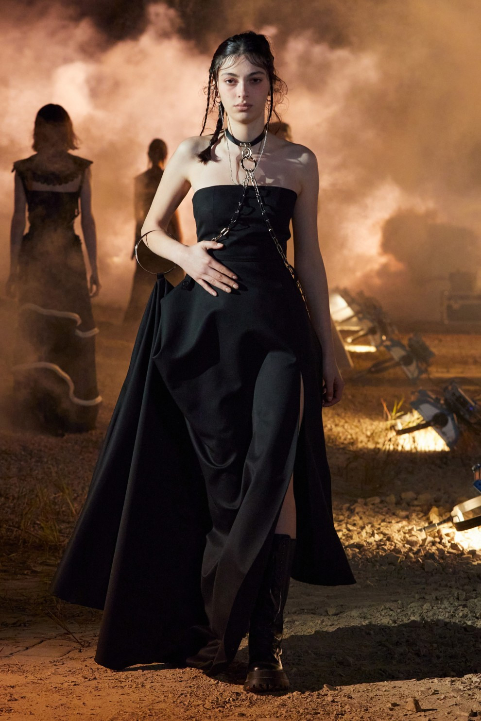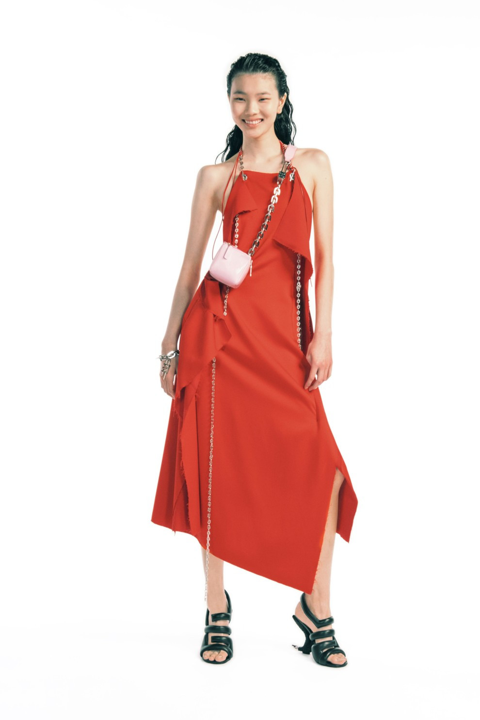 Платья с цепочками плавно переместились из зимнего гардероба в весенний. Если на показах No.21 и Bottega Veneta осень-зима 2020/2021 мы видели лаконичные трикотажные платья с вырезами, обрамленные крупными звеньями, которые впоследствии полюбили главные streetstyle-звезды, то в новом сезоне цепи также играют первоочередную роль. Дизайнеры переосмыслили цепные мотивы и предложили новые решения для теплого сезона. Так, Schiaparelli разместили элегантную золотую цепь по диагонали на черном минималистичном платье, Givenchy использовали цепи вместо бретелек на черном и алом платьях, Paco Rabbane дополнили нарядный серебристый образ миниатюрной цепочкой на талии, а Rokh показали платья, щедро приправленные БДСМ-эстетикой - кожаными сбруями, портупеями, ошейниками и обилием металлических звеньев.