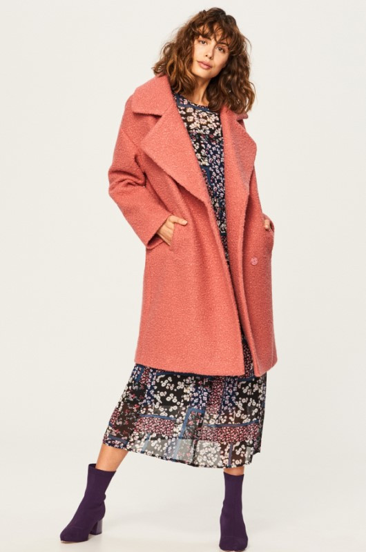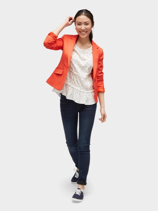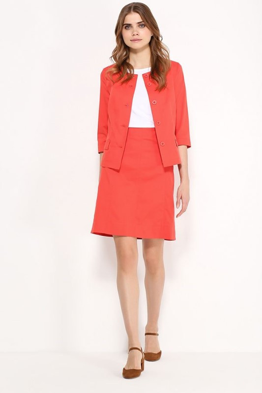 Всего один элемент гардероба в коралловом цвете способен оживить образ и сделать его теплым и располагающим к себе. Это могут быть как жакеты, так и брюки.