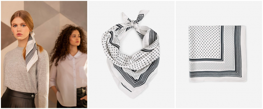 Этот аксессуар с актуальным геометрическим принтом преобразит однотонный образ. Четкие линии, рябящие точки и прямые углы будто создают направление, которое ведет в одну сторону — к стилю. Используйте такие косынки в качестве украшений для волос, подвязывайте на пояс или на сумку-шоппер — творческий подход только приветствуется.