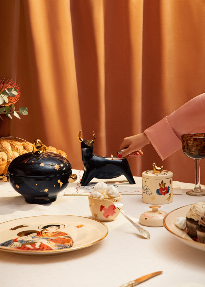 В рождественскую коллекцию вошли керамические тарелки двух размеров, салатник, макитра для кути, (традиционная форма для углу), разнообразные формы для закусок, сахарницы, вазы и свечи в форме бычка.