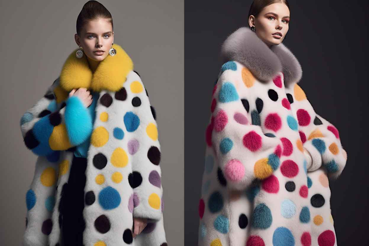 - Сходство с популярным стилем ретро придаст дополнение шубы пастельных оттенков крупным рисунком в горошек, контрастирующим с основным фоном. Альтернативный вариант – украсить меховое изделие изображениями сердечек, придающих образу романтичности.