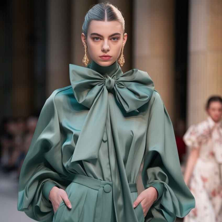 - Невероятно романтично выглядят шелковые либо атласные блузы, ворот которых дополнен крупным бантом. Последний выступает в качестве акцентной детали образа. Блузки можно сочетать с джинсами или прямыми брюками, облегающими фигуру или расклешенными юбками, сарафанами фасона «футляр».