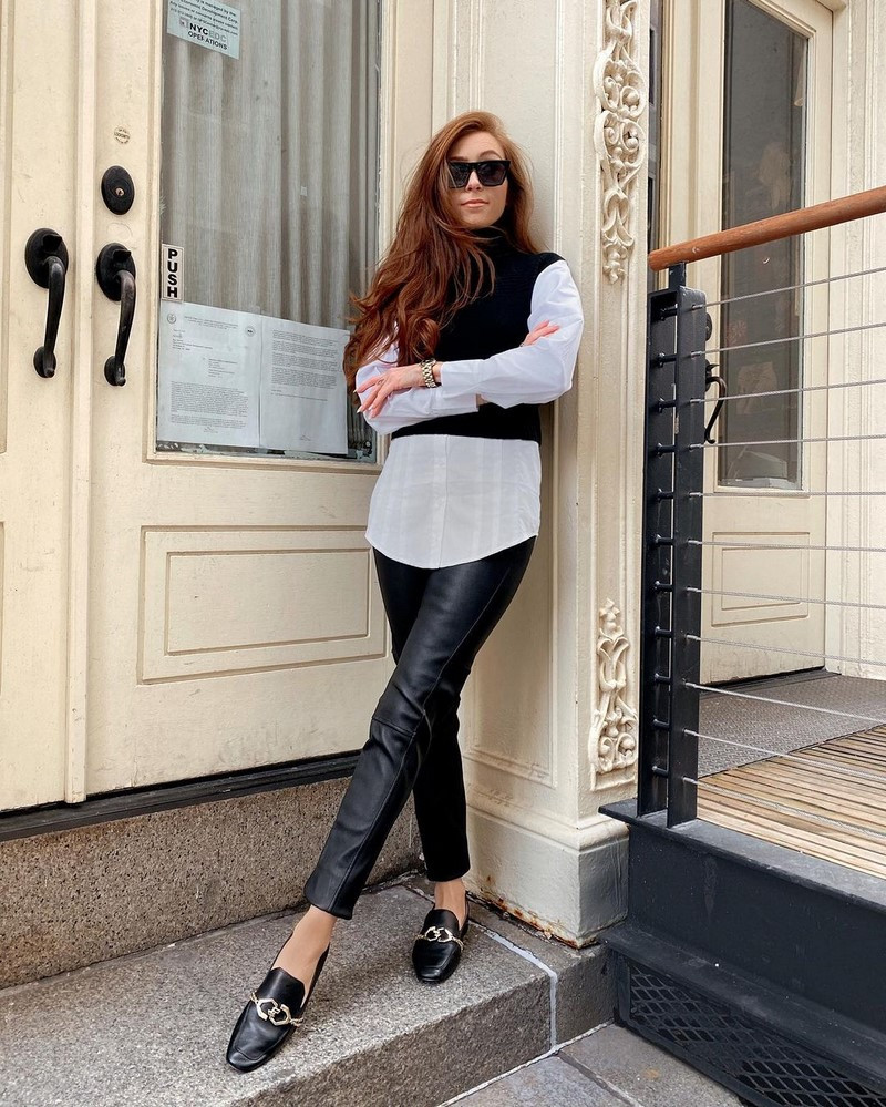 - Любительницы неординарных луков оценят кожаный жилет, созданный в корсетном варианте. Под низ допускается надеть классическую рубашку или воздушную шифоновую блузку.