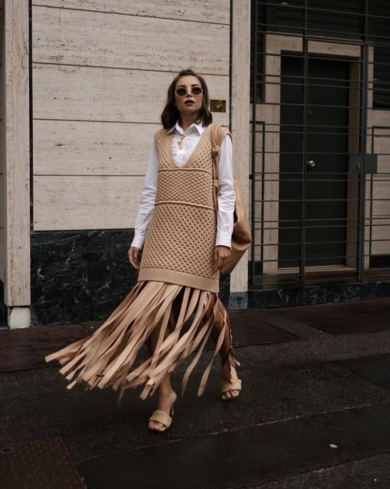 - Оригинальным решением станет удлинённый жилет, который может выступать альтернативой платью. Любительницам стиля бохо придутся по душе модели, дополненные широкой бахромой, размещённой по подолу.