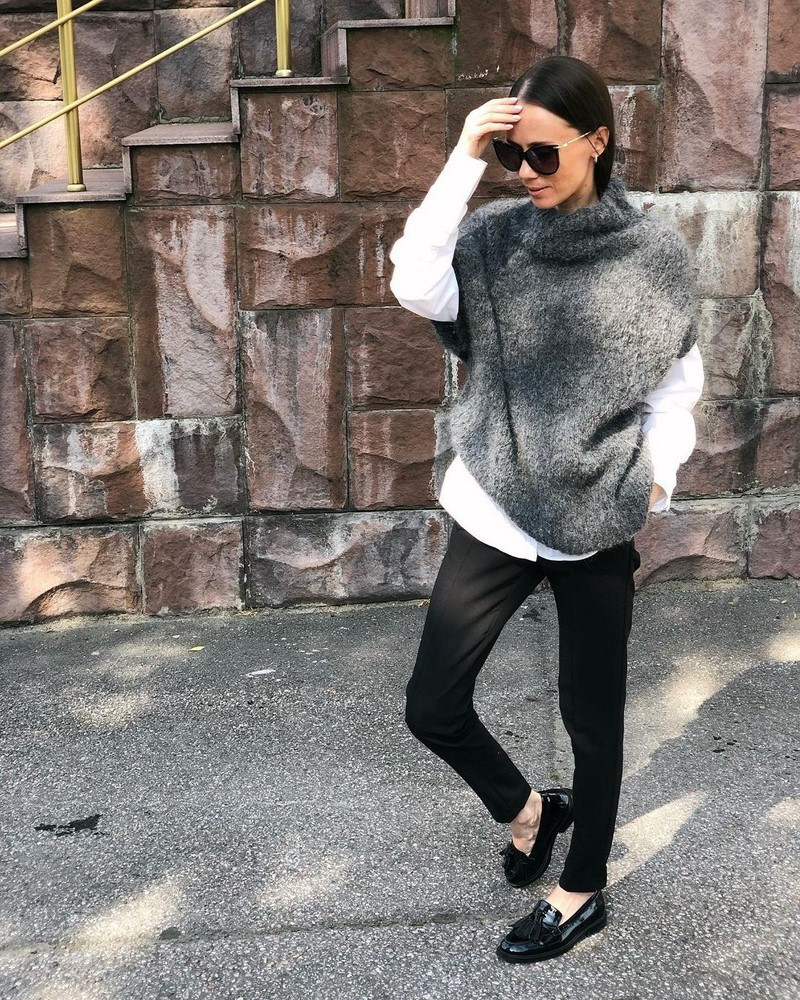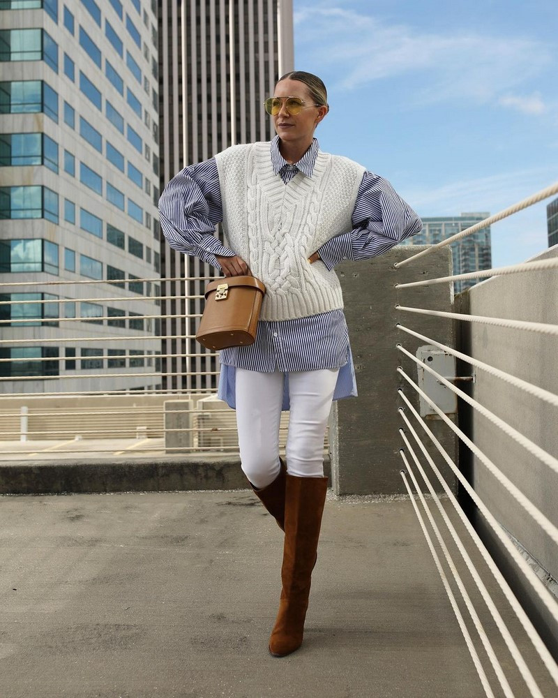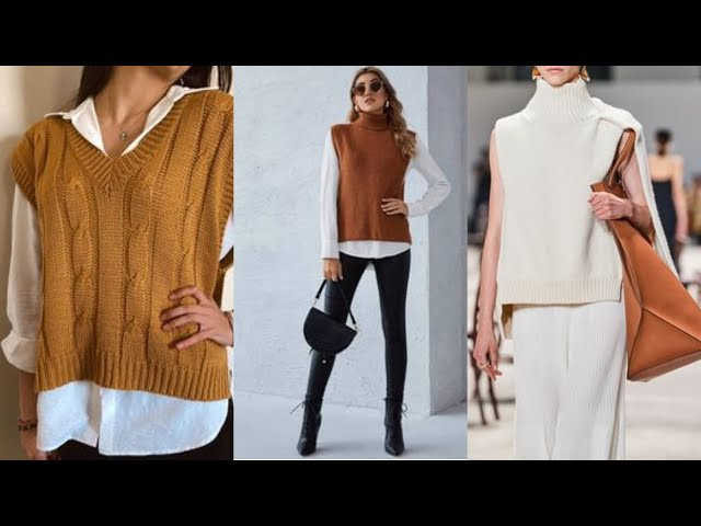 - Неизменно актуальным остаётся вязаный жилет, который незаменим при воплощении демисезонных луков. Его надевают поверх удлинённой рубашки или водолазки под горло.