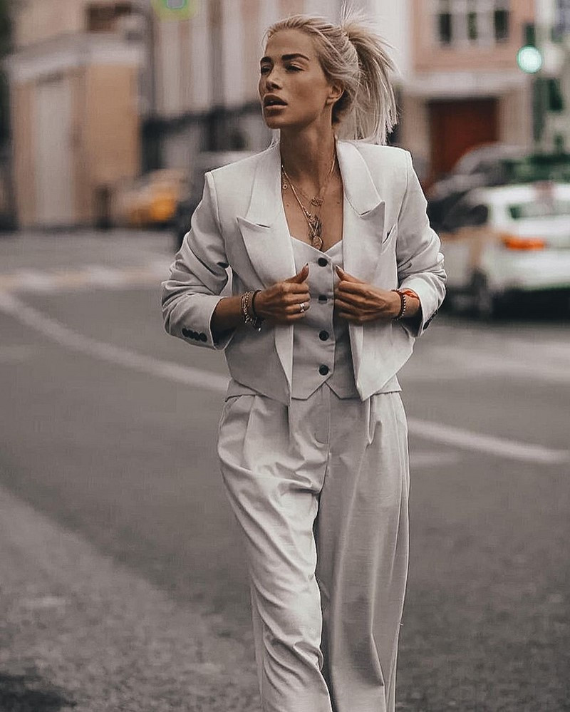 - При создании офисного образа пользуется популярностью жилетка, которая может стать составляющей делового брючного комплекта. Поверх неё надевают удлинённый пиджак или укороченный жакет. Допускается сочетание с блузками либо рубашками или ношение жилетки моно.