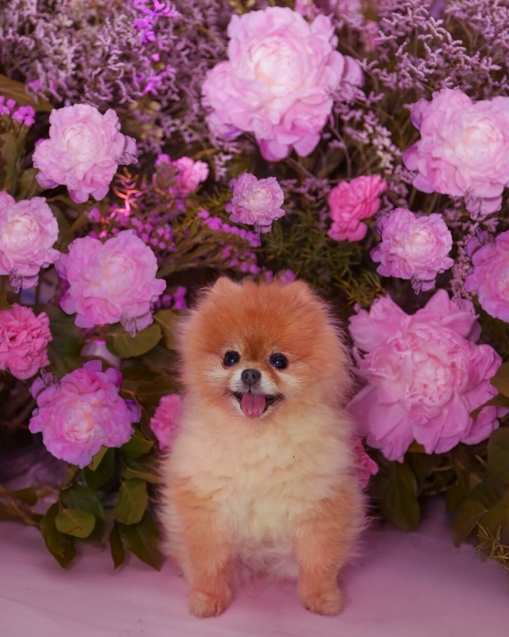 Серед гостей була собака породи померанський шпіц на ім"я Лола. Лола позувала серез декорацій – рожевих півоній.