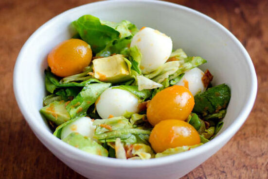 Если у вас есть перепелиные яйца, то можете их отварить и приготовить вот такой салатик из следующих ингредиентов: