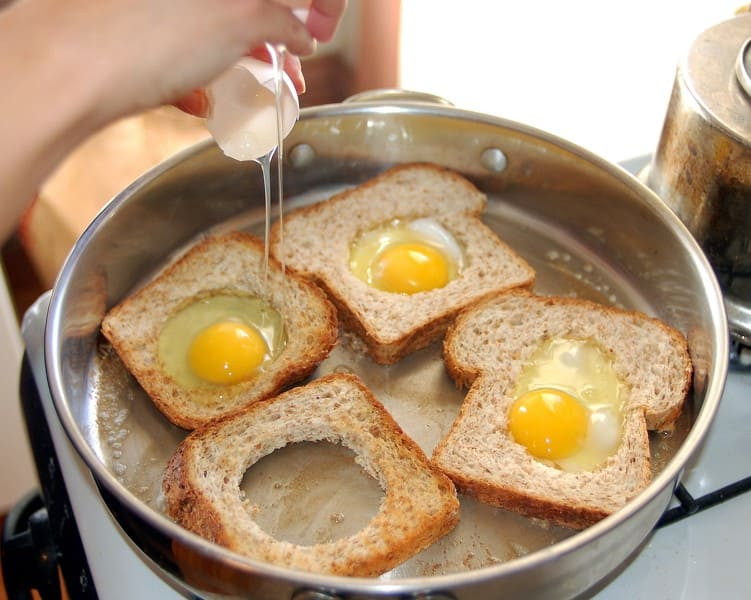Приготовить такой оригинальный завтрак очень просто, однако здесь необходимо иметь некоторую сноровку. Для этого берем хлеб любой формы и с помощью маленького стаканчика или рюмочки прорезаем дырочку в нем. Кладем на сковороду и обжариваем одну сторону. После переворачиваем, вливаем в эту дырочку яйцо и жарим до готовности.