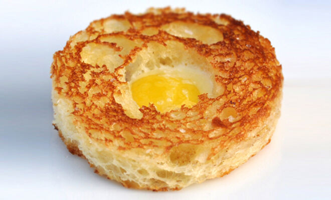 Это самый простой способ приготовления этого блюда. Есть и более красивые варианты. Например можно взять булочку-бриошь, очистить ее от корочки и пожарить на масле черного трюфеля или просто на растительном масле. Такой вариант подойдет и для праздничного стола.