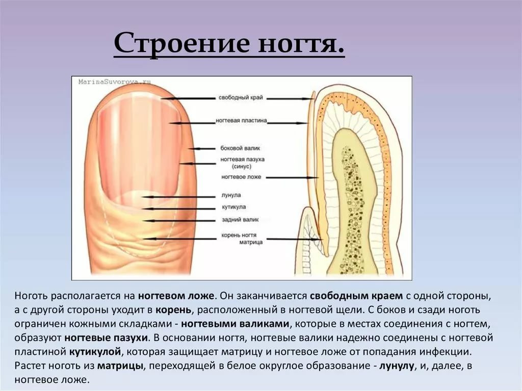 Ноготь состоит из: матрикса (корня ногтя), ногтевой лунулы, тела ногтя (ногтевой пластины), кутикулы и свободного края ногтя.