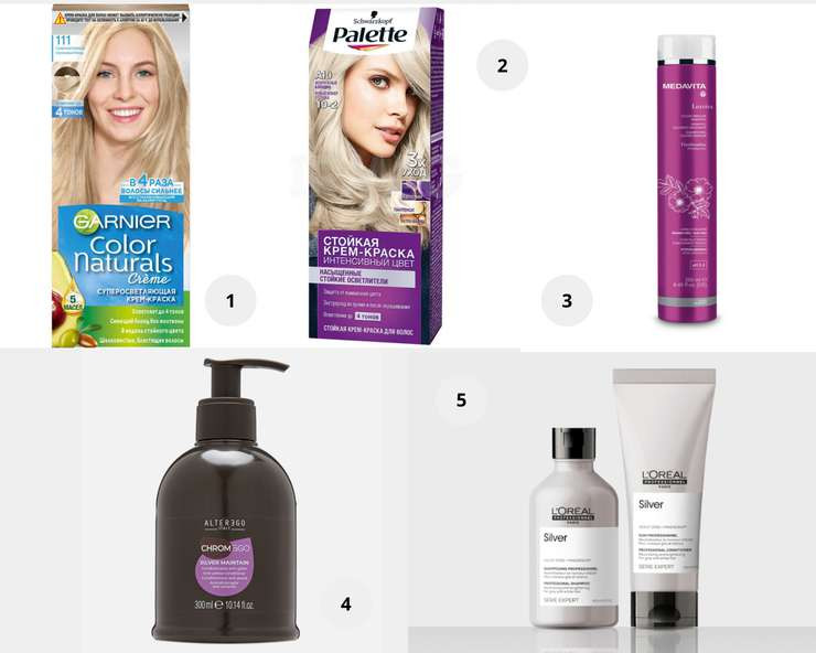1. Линейка красок для волос Color Naturals, Garnier. 2. Краска Палетт Интенсивность цвета. 3. Luxviva Шампунь оттеночный Пепельный. 4. Кондиционер для нейтрализации желтых оттенков CHROMEGO SILVER MAINTAIN. 5. L’Oreal Professionnel Paris Гамма средств для ухода за обесцвеченными и седыми волосами Silver.